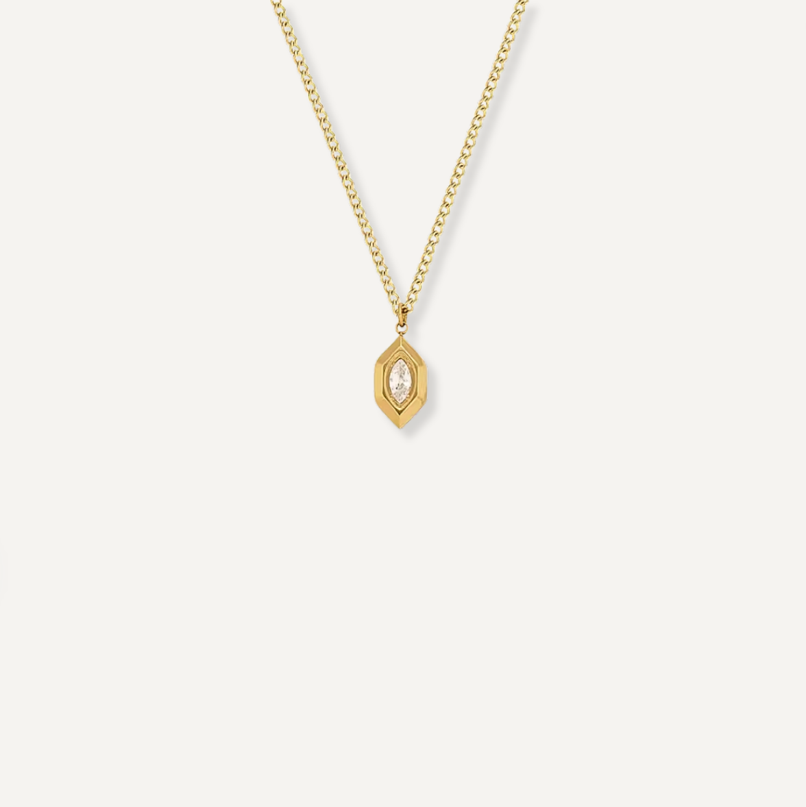 Le collier Elara incarne la finesse et la modernité dans une pièce au design géométrique et raffiné. Conçu en acier inoxydable, un matériau durable et hypoallergénique, il résiste parfaitement au quotidien tout en conservant son éclat. Son pendentif facetté, orné d’un zircon étincelant, apporte une touche lumineuse et sophistiquée qui élève instantanément n’importe quelle tenue.