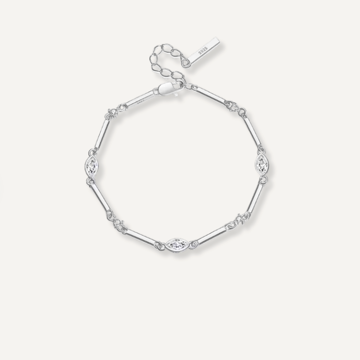 Le bracelet Iséa séduit par son design délicat et sa brillance subtile. Réalisé en argent sterling 925 et sublimé par un plaqué or 18K, il offre un équilibre parfait entre finesse intemporelle et élégance moderne. Les maillons élancés sont délicatement ornés de zircons lumineux, dont les pierres principales, taillées en navette de 6,8 mm, captent la lumière avec une intensité remarquable.