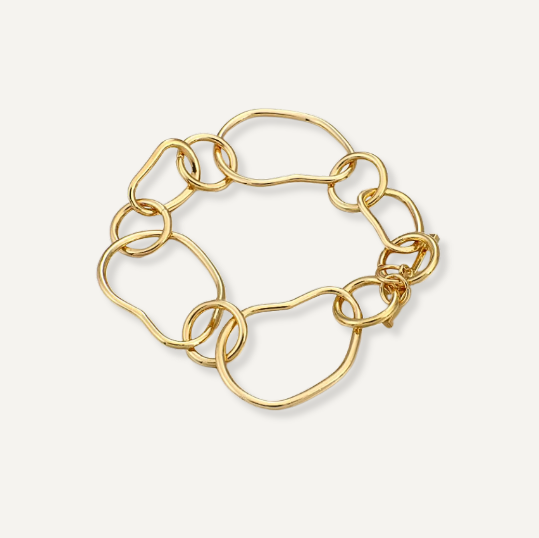 Náramek Pénélope kombinuje moderní design s nádechem sofistikovanosti díky elegantním, splývavým článkům. Je vyroben z ušlechtilé oceli a pozlacen 18karátovým zlatem a má řetízek z nepravidelných článků, který vytváří jedinečný vizuální efekt. Tento náramek je skutečným stylovým počinem, který vnese do každého pohybu texturu a lesk.