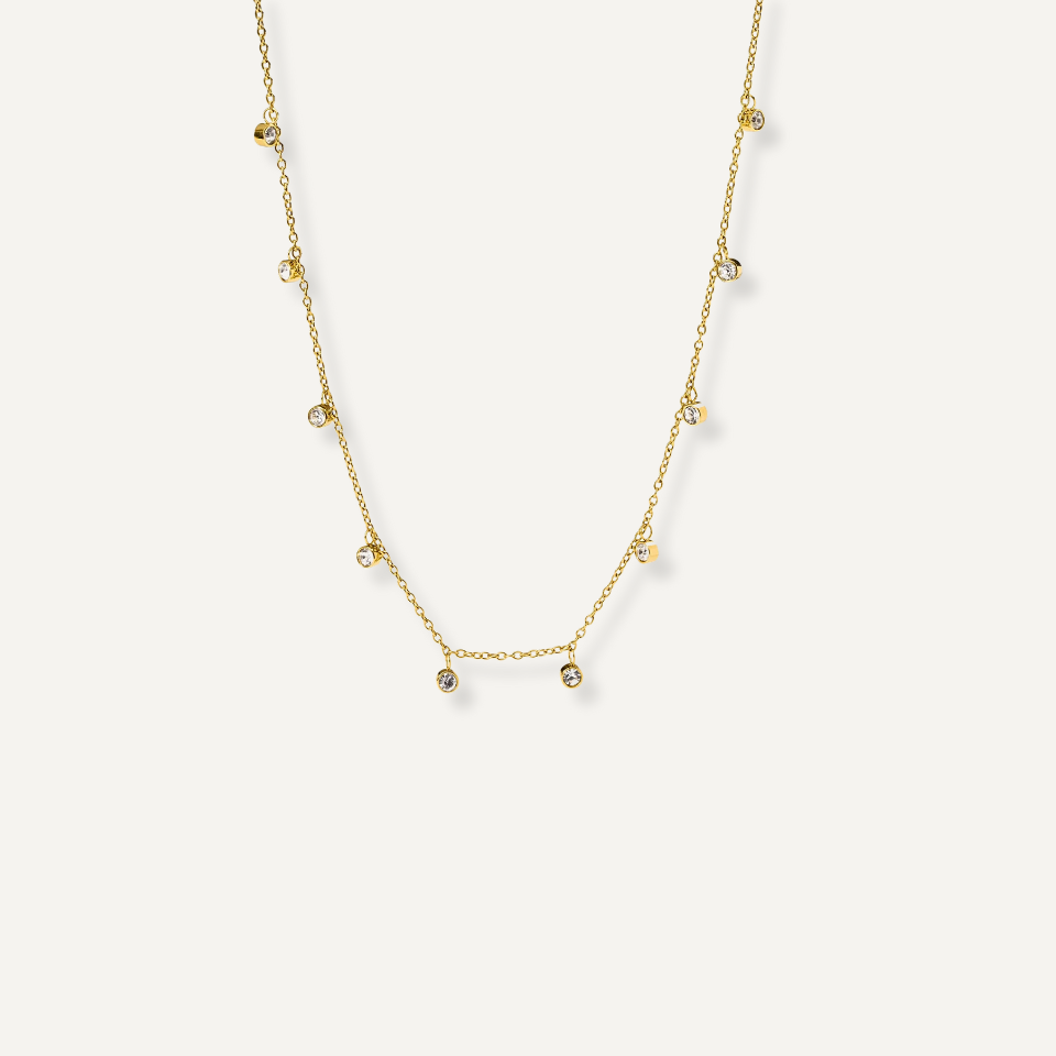 Náhrdelník Valentina ztělesňuje moderní eleganci s nádechem luxusu. Tento náhrdelník o délce 40 cm + 5 cm, vyrobený z nerezové oceli a pozlacený 18karátovým zlatem, zdobí přívěsky se zirkony, které každému pohybu dodají jemný třpyt. Kameny, jemně uspořádané na řetízku, dodávají rafinovaný třpyt, ideální pro rozjasnění jakéhokoli outfitu.